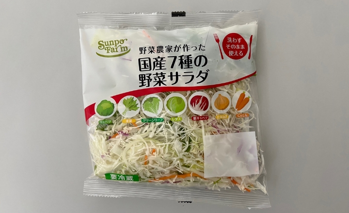 パッケージの商品名通り、育苗・栽培・収穫からカット・包装まで、すべて国産野菜で、国内工場で「サラダ」にしました。
